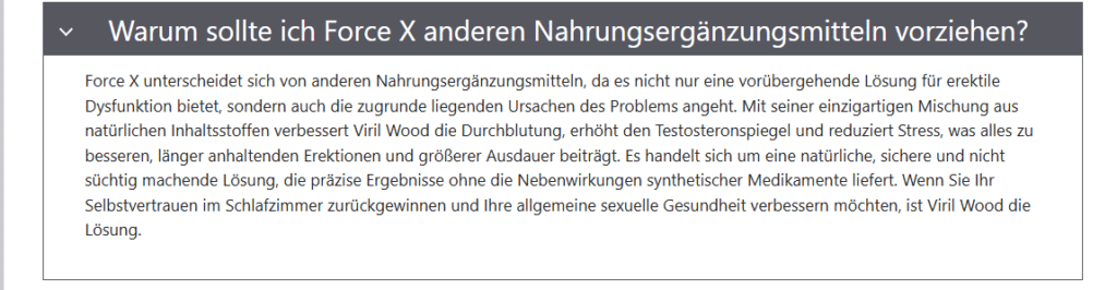 Tausende von Menschen haben mit Force X Tabletten ihre sexuelle Leistungsfähigkeit erfolgreich verbessert, indem sie ihre erektile Dysfunktion überwunden und ihre Ausdauer gesteigert haben.